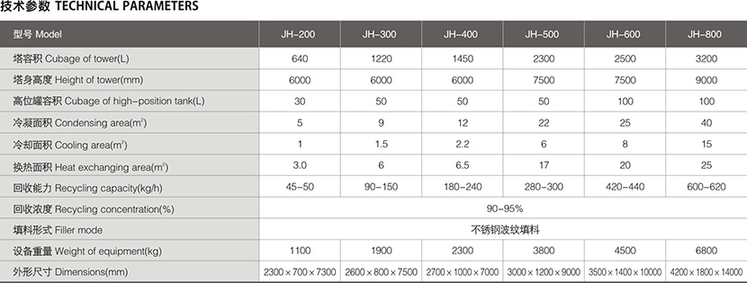 本装置采用高效不锈钢波纹填料,凡接触酒精部位,如塔体、冷凝器、稳压罐、冷却蛇管等均采用不锈,以确保成品酒精不被污染,塔釜采用可拆式U型管,这样,便于对加热外壁及蒸馏釜内壁进行清洗。本设备可采用外加热JHW或内加热JHN两种形式,外加热蒸发速度快,较多适用于JH-500以上结构,可边回收酒精浓缩料液。