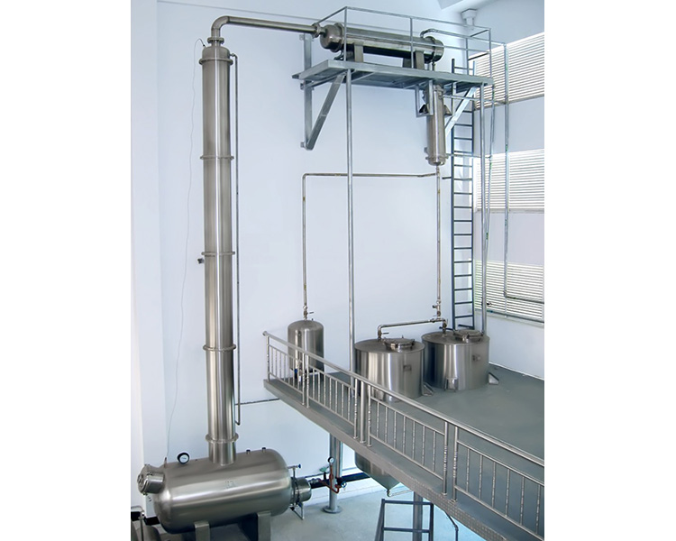 本装置采有高效不锈钢波纹填料,凡接触酒精部位,如塔体、冷凝器、稳压罐、冷却蛇管等均采用不锈钢,确保成品酒精不被污染,塔釜采用可拆式U型,便于对加热外壁及蒸馏釜内壁进行清洗,符合(GMP)标准要求。
